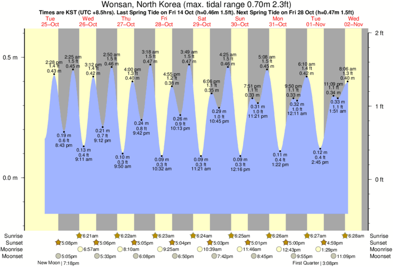 Wonsan tide chart key: The tide chart above shows the height and times of high tide and low tide for Wonsan, North Korea. The grey shading corresponds to nighttime hours between sunset and sunrise at Wonsan.