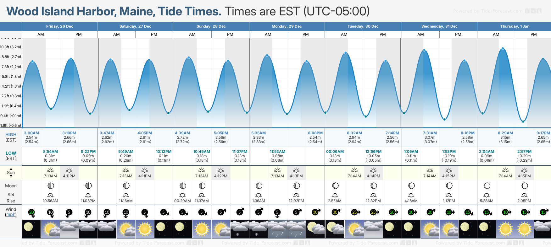 December and January Tide charts for Wood Island Harbor: The tide charts below show the height, time and date of high and low tides for the next 30 days.
