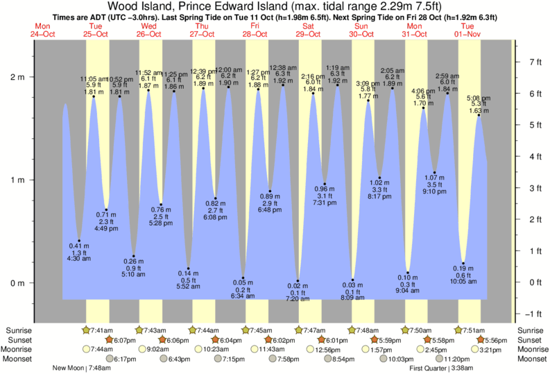 Wood Island tide chart key: The tide chart above shows the height and times of high tide and low tide for Wood Island, Prince Edward Island. The grey shading corresponds to nighttime hours between sunset and sunrise at Wood Island.