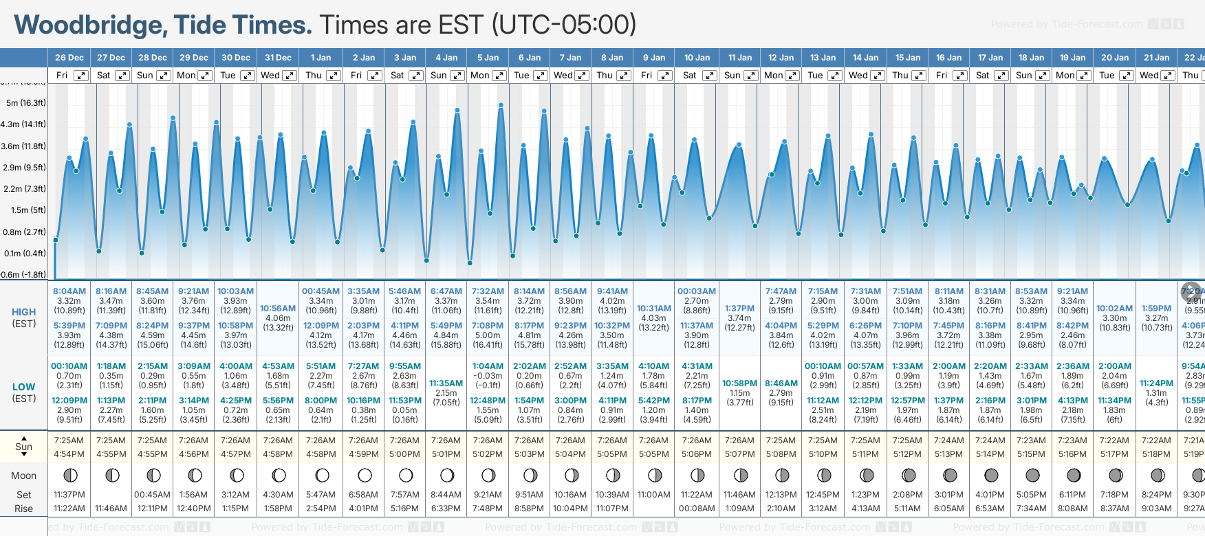 Tide chart for WoodbridgeShowing low and high tide times for the next 30 days at Woodbridge. Tide Times are EST (UTC -5.0hrs).