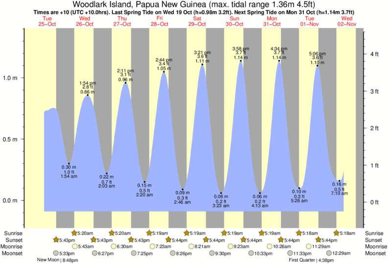 December and January Tide charts for Woodlark Island: The tide charts below show the height, time and date of high and low tides for the next 30 days.