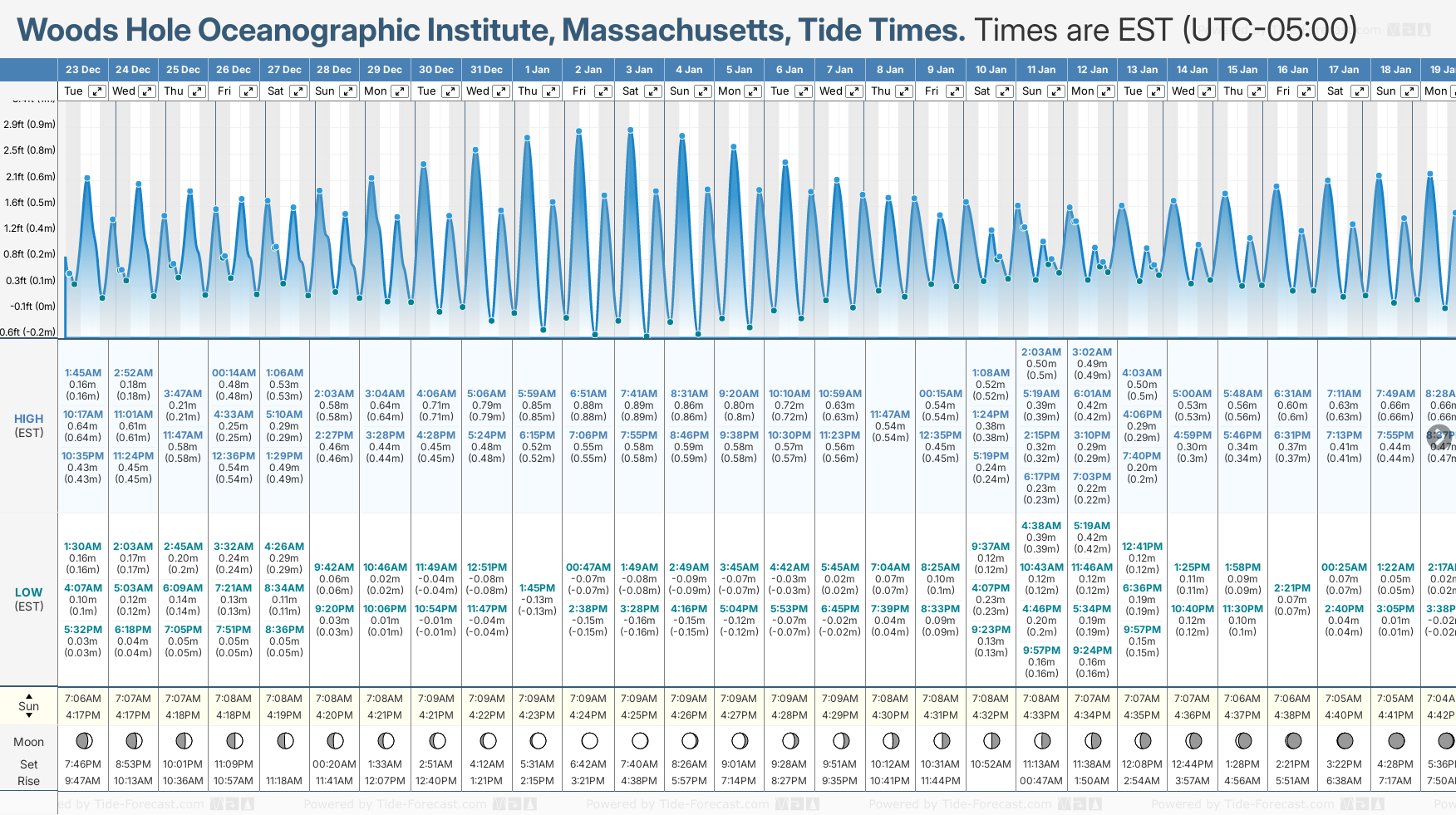 Tide chart for Woods Hole Oceanographic InstituteShowing low and high tide times for the next 30 days at Woods Hole Oceanographic Institute. Tide Times are EST (UTC -5.0hrs).