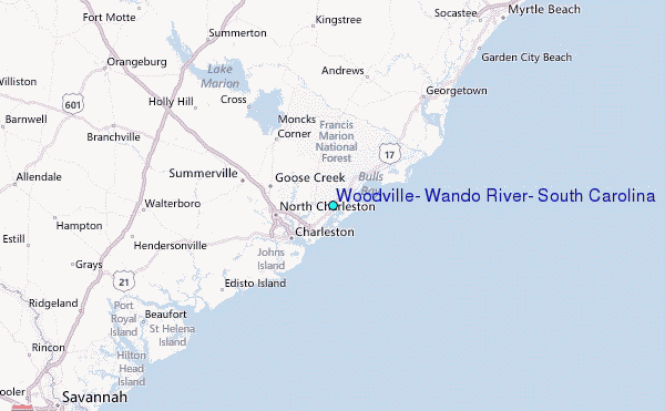 Use this relief map to navigate to tide stations, surf breaks and cities that are in the area of Woodville, Wando River, South Carolina.