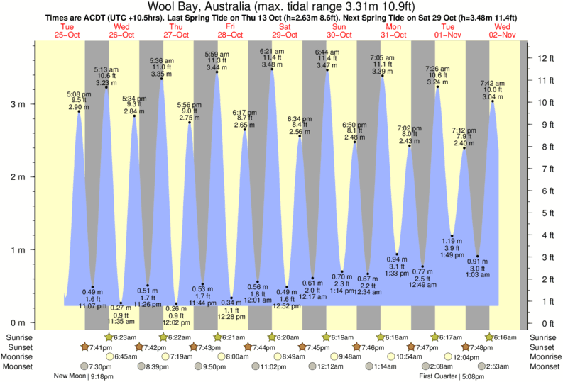 Tide chart for Wool BayShowing low and high tide times for the next 30 days at Wool Bay. Tide Times are ACDT (UTC +10.5hrs).