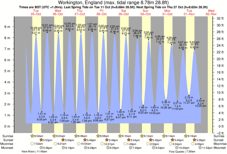 Tide Times are GMT (UTC +0hrs). Last Spring High Tide at Workington was on Sat 06 Dec (height: 8.65m 28.4ft). Next high Spring Tide at Workington will be on Mon 22 Dec (height: 7.94m 26.0ft).