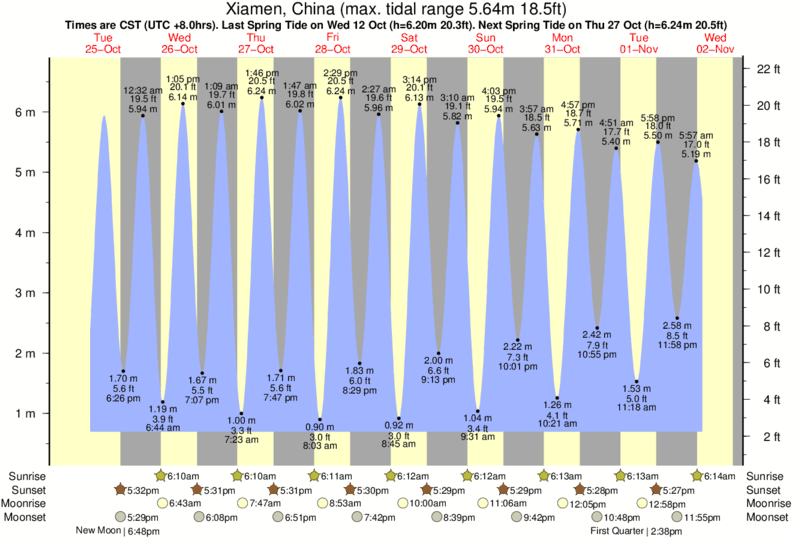 Tide Times are CST (UTC +8.0hrs). Last Spring High Tide at Xiamen was on Sat 06 Dec (height: 6.26m 20.5ft). Next high Spring Tide at Xiamen will be on Mon 22 Dec (height: 5.83m 19.1ft).