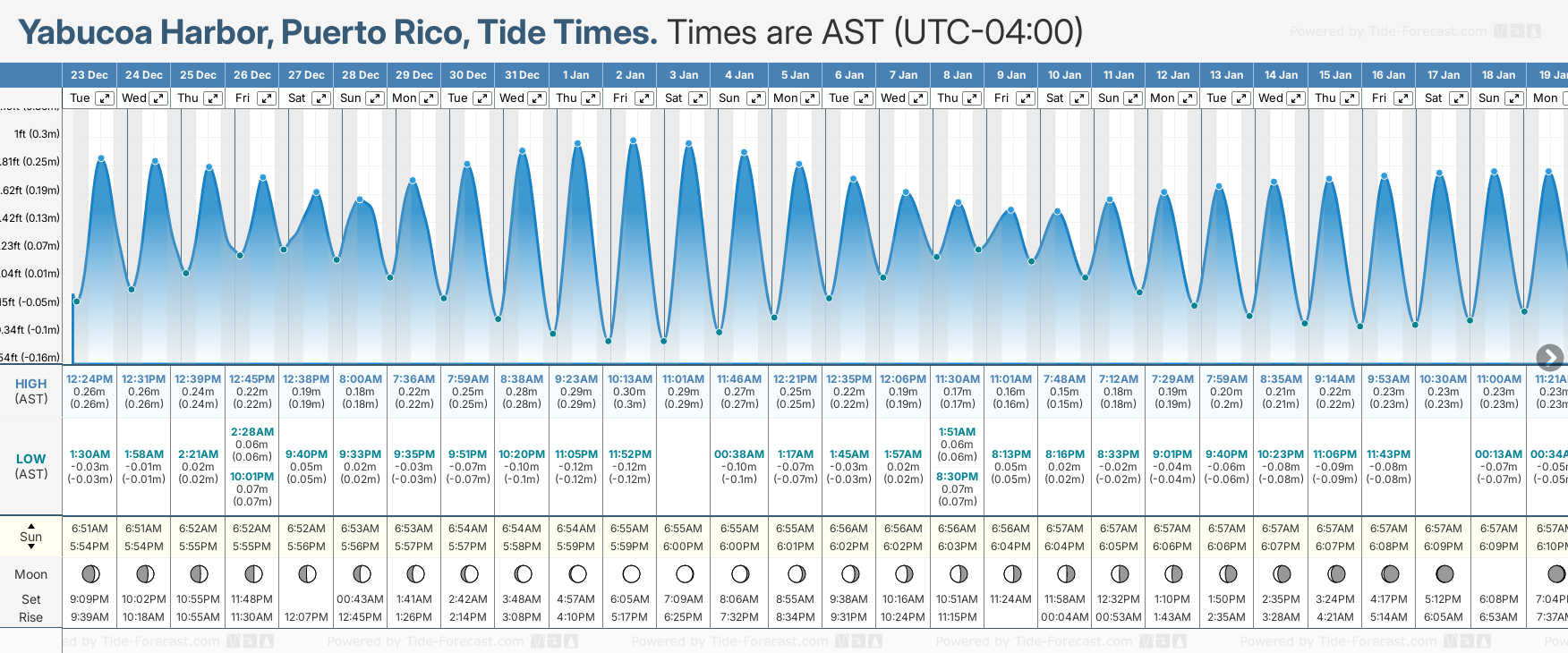 December and January Tide charts for Yabucoa Harbor: The tide charts below show the height, time and date of high and low tides for the next 30 days.