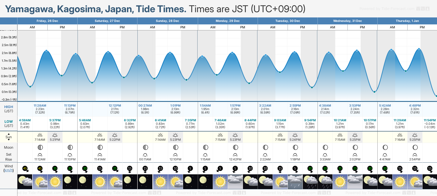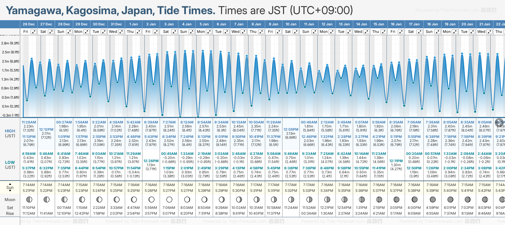December and January Tide charts for Yamagawa: The tide charts below show the height, time and date of high and low tides for the next 30 days.
