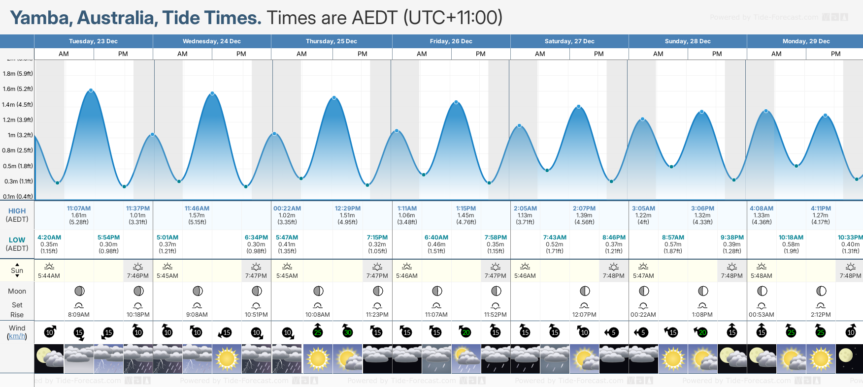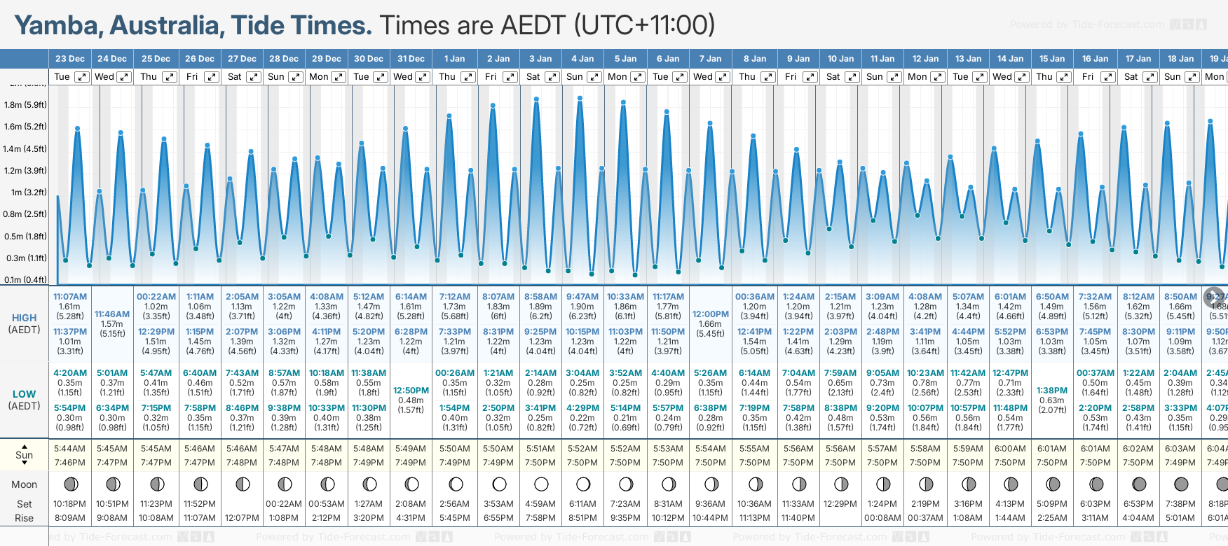 December and January Tide charts for Yamba: The tide charts below show the height, time and date of high and low tides for the next 30 days.