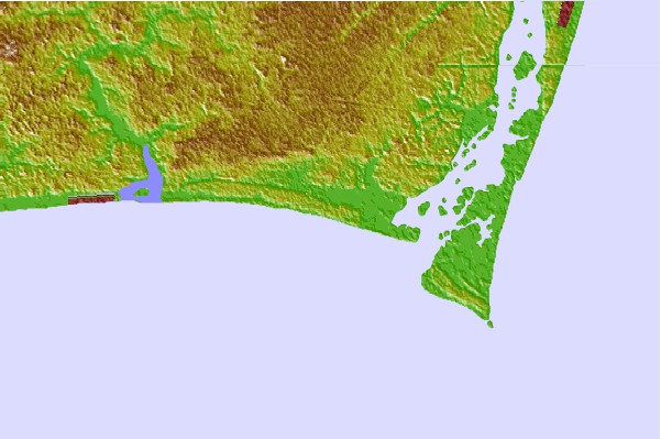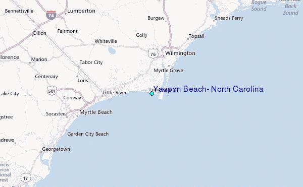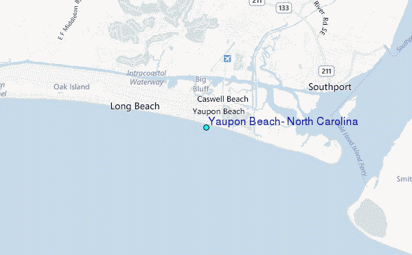 Use this relief map to navigate to tide stations, surf breaks and cities that are in the area of Yaupon Beach, North Carolina.
