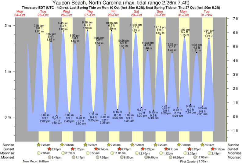 Yaupon Beach tide chart key: The tide chart above shows the height and times of high tide and low tide for Yaupon Beach, North Carolina. The grey shading corresponds to nighttime hours between sunset and sunrise at Yaupon Beach.