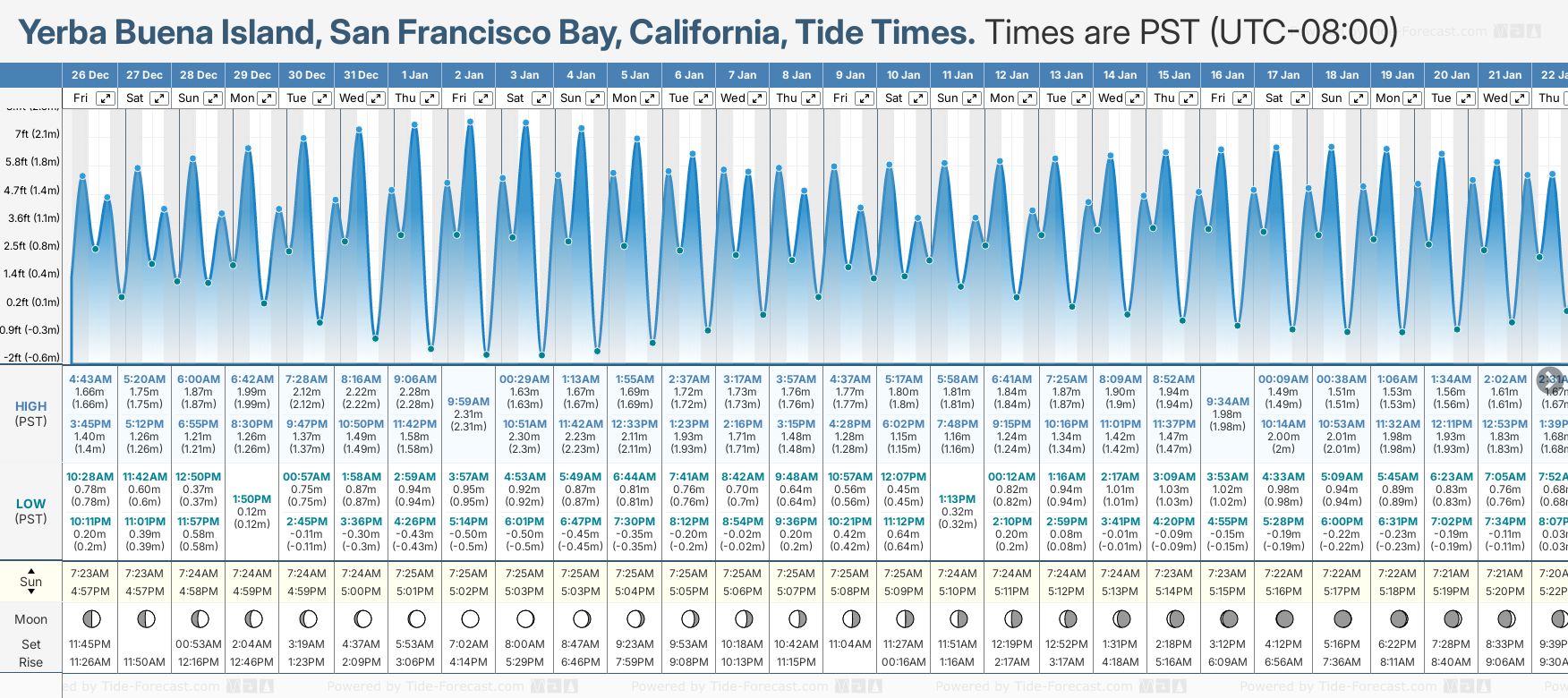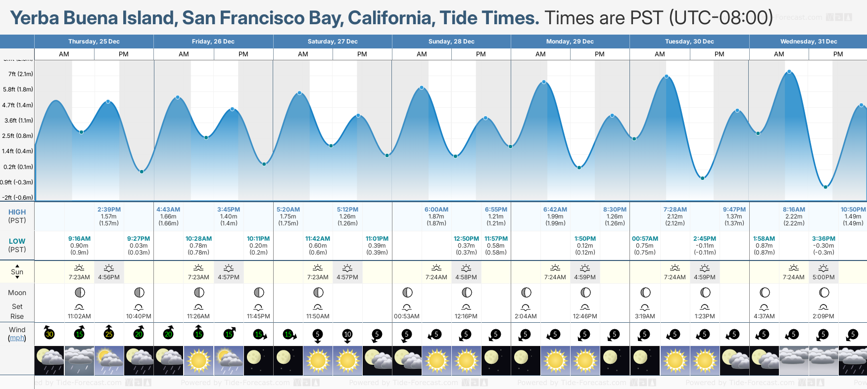 Tide chart for Yerba Buena Island, San Francisco BayShowing low and high tide times for the next 30 days at Yerba Buena Island, San Francisco Bay. Tide Times are PST (UTC -8.0hrs).