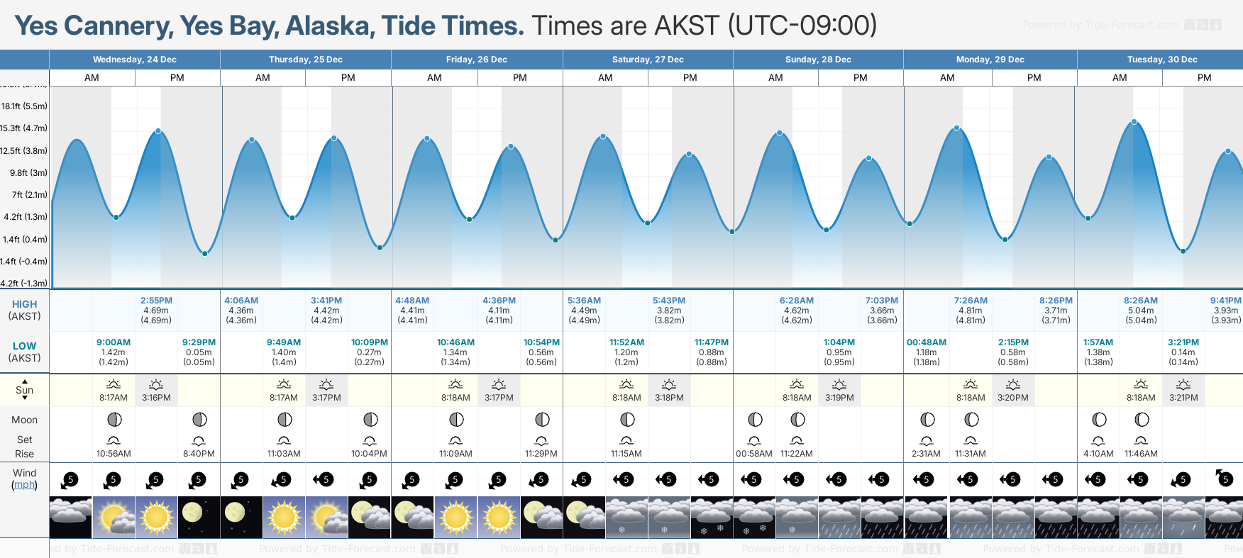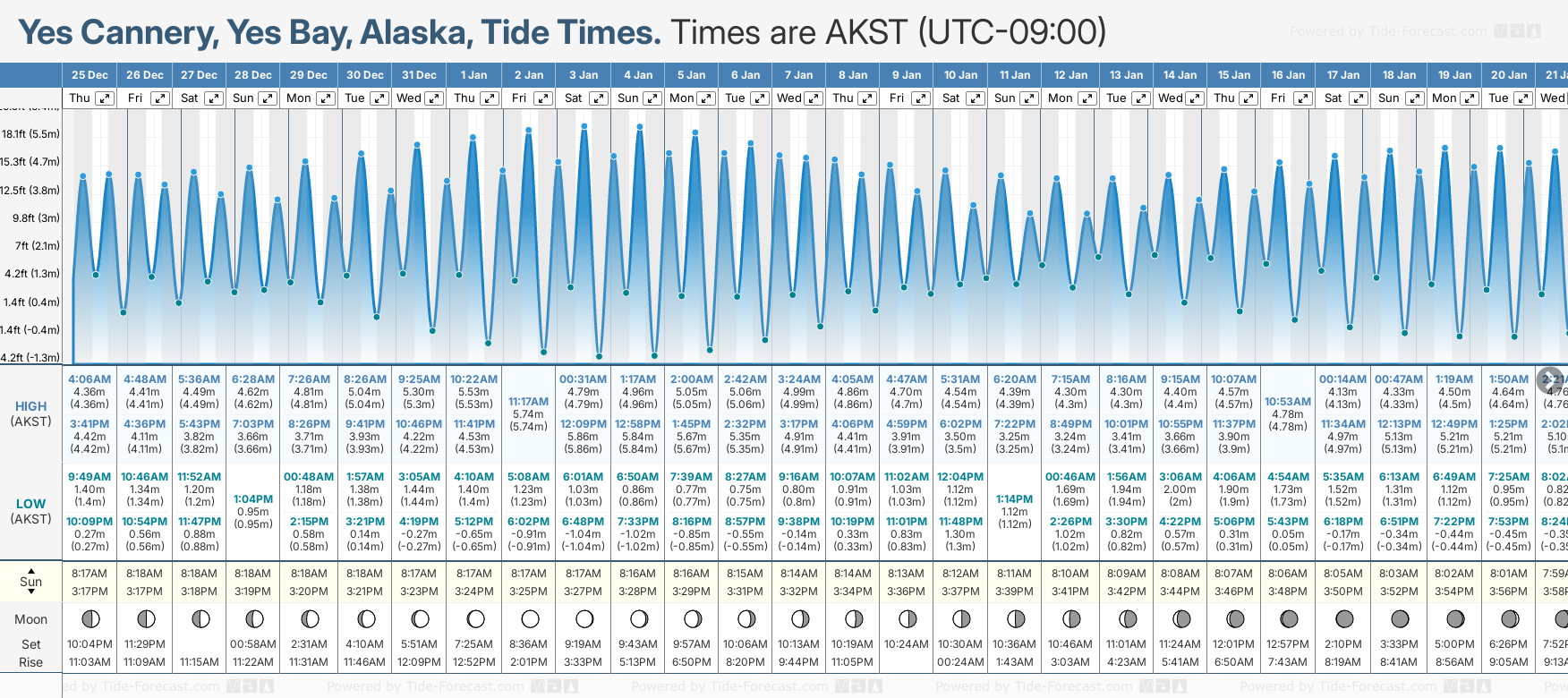 Tide Times are AKST (UTC -9.0hrs). Last Spring High Tide at Yes Cannery, Yes Bay was on Sun 21 Dec (height: 5.10m 16.7ft). Next high Spring Tide at Yes Cannery, Yes Bay will be on Sat 03 Jan (height: 5.86m 19.2ft).