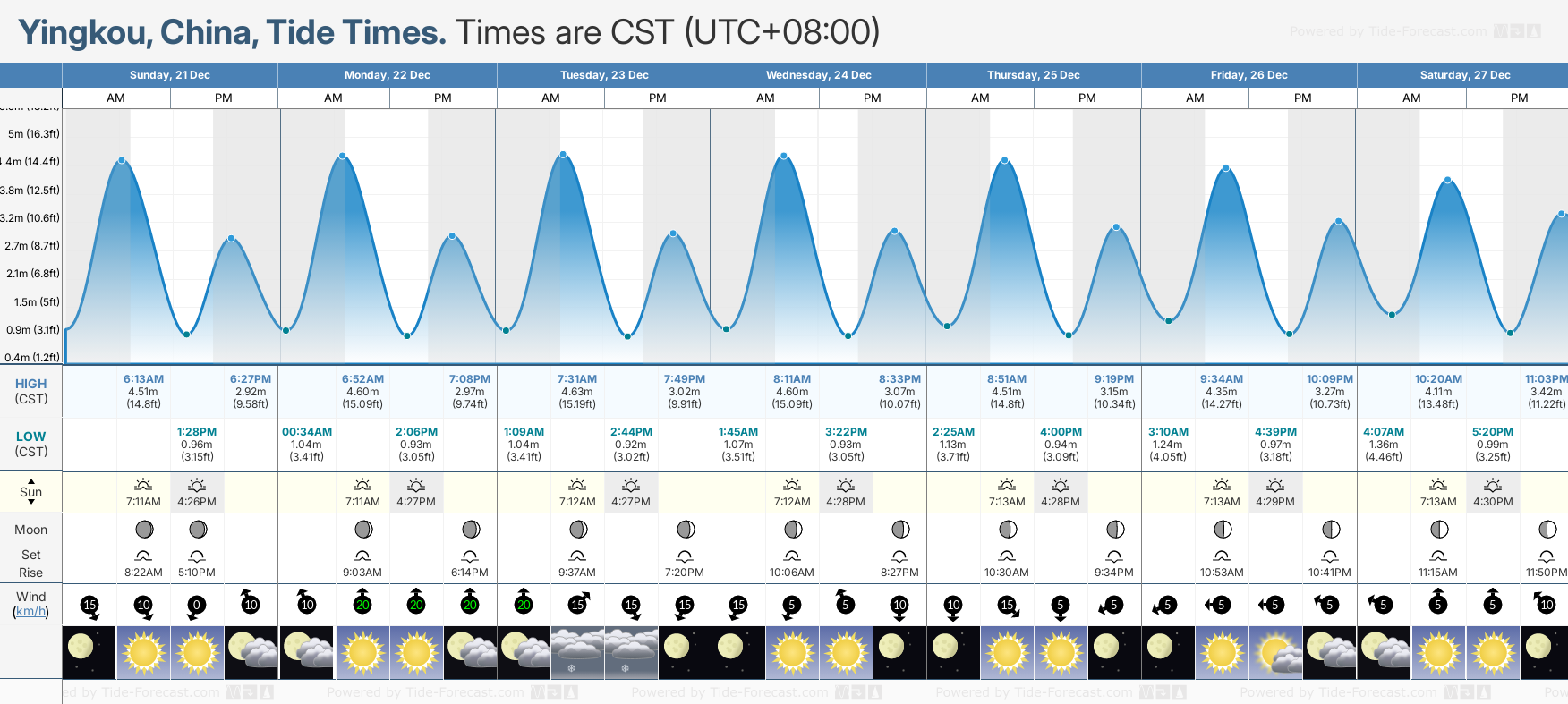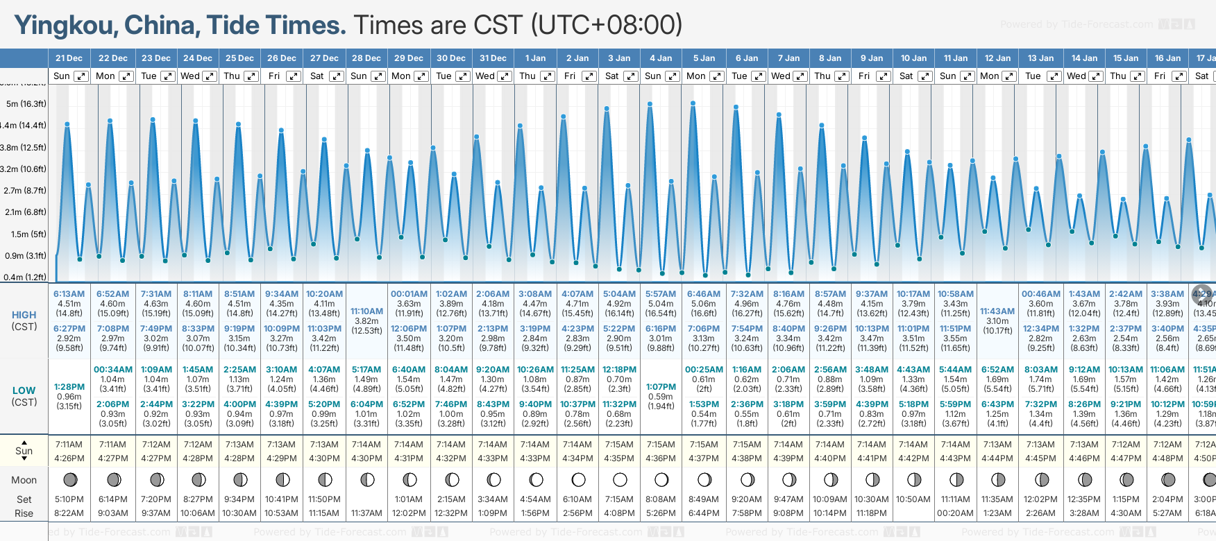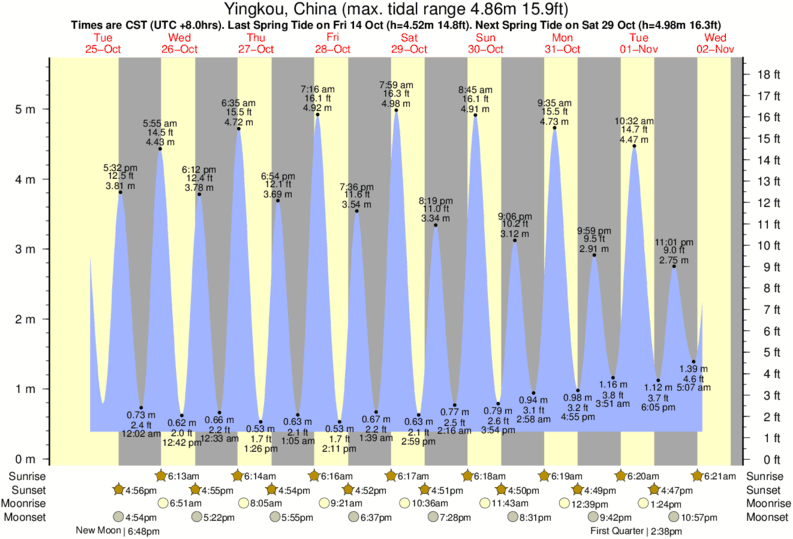 Tide Times are CST (UTC +8.0hrs). Last Spring High Tide at Yingkou was on Sun 07 Dec (height: 5.27m 17.3ft). Next high Spring Tide at Yingkou will be on Tue 23 Dec (height: 4.63m 15.2ft).
