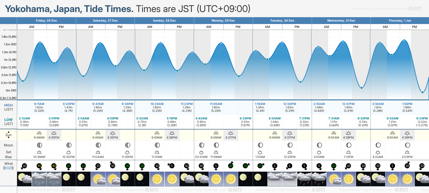 December and January Tide charts for Yokohama: The tide charts below show the height, time and date of high and low tides for the next 30 days.