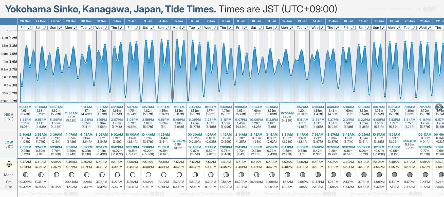 Tide Times are JST (UTC +9.0hrs). Last Spring High Tide at Yokohama Sinko was on Mon 22 Dec (height: 1.82m 6.0ft). Next high Spring Tide at Yokohama Sinko will be on Sun 04 Jan (height: 1.85m 6.1ft).