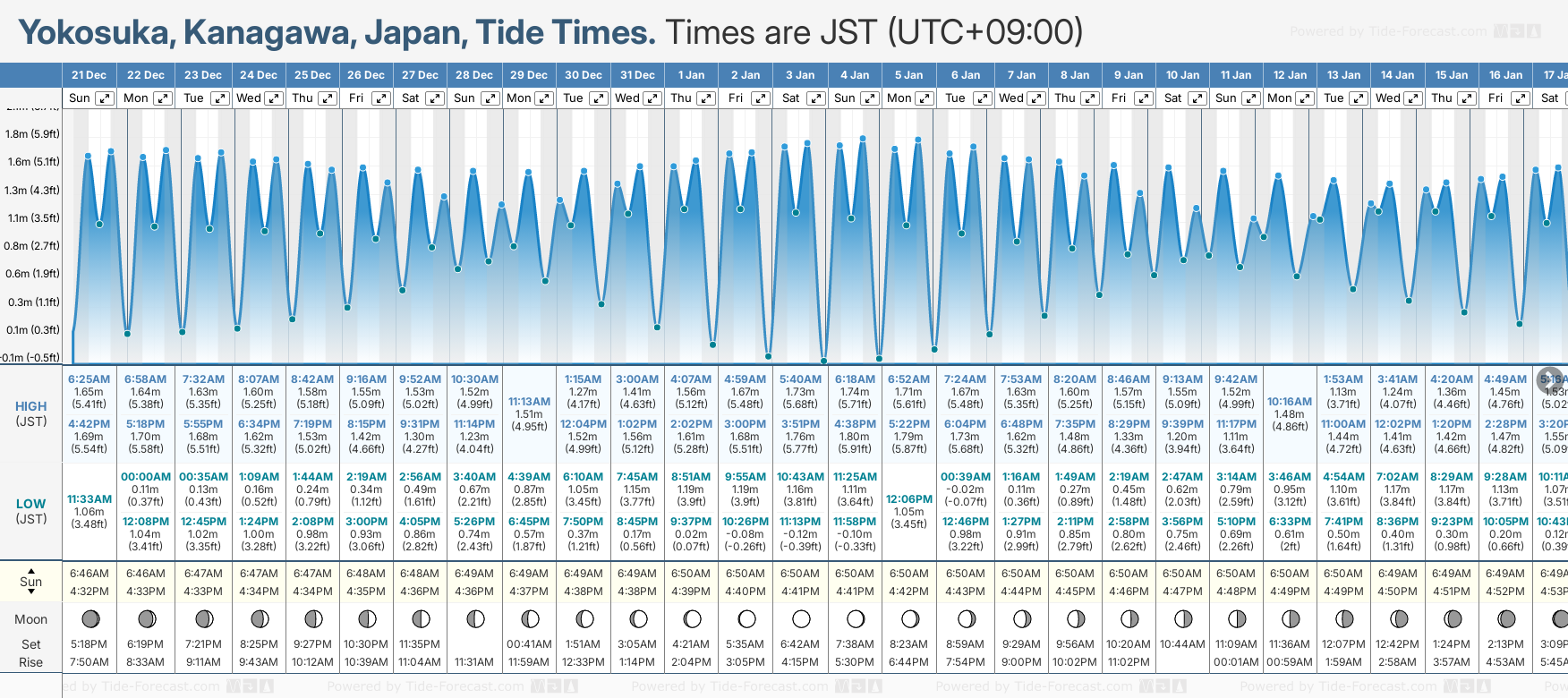 December and January Tide charts for Yokosuka: The tide charts below show the height, time and date of high and low tides for the next 30 days.