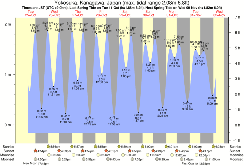 Tide chart for YokosukaShowing low and high tide times for the next 30 days at Yokosuka. Tide Times are JST (UTC +9.0hrs).