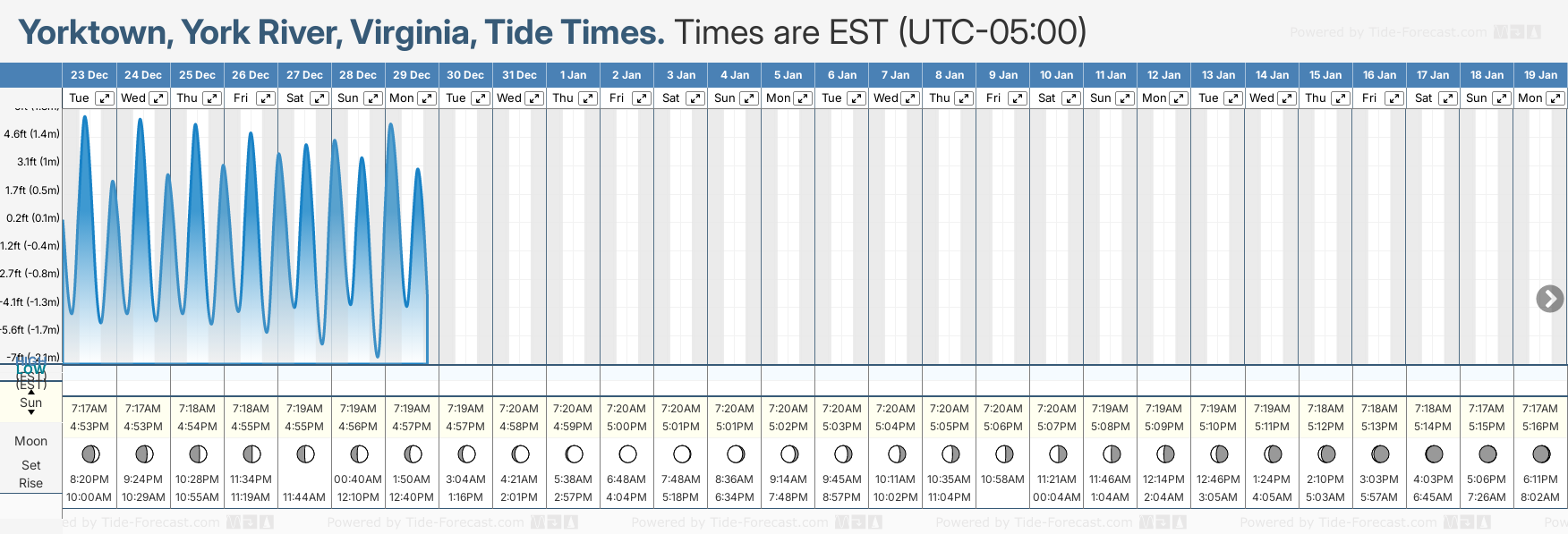 December and January Tide charts for Yorktown, York River: The tide charts below show the height, time and date of high and low tides for the next 30 days.