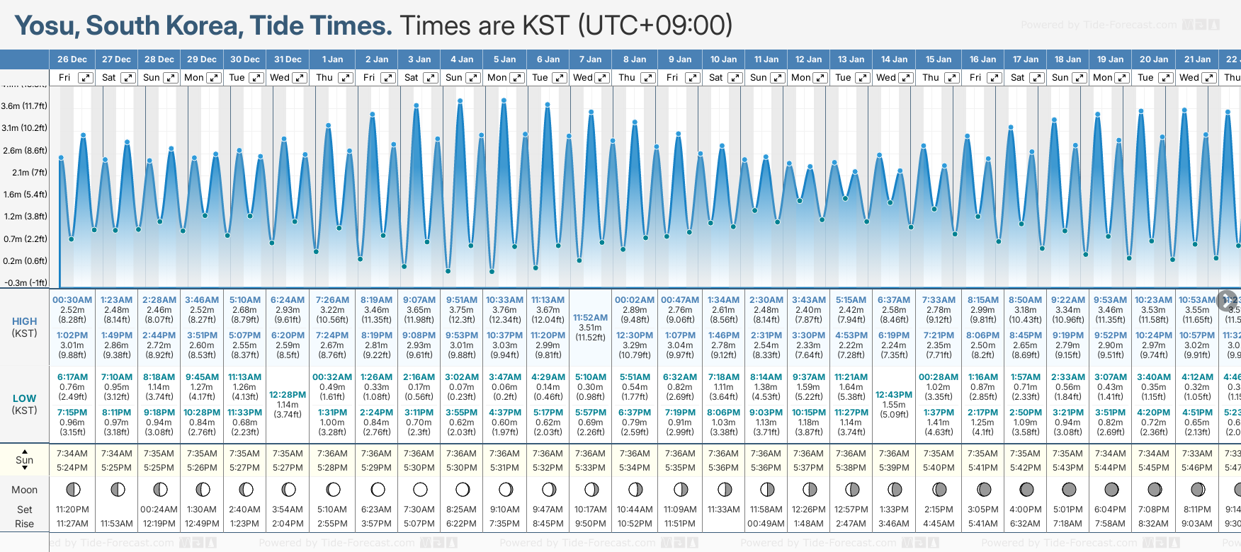 Tide Times are KST (UTC +9.0hrs). Last Spring High Tide at Yosu was on Mon 22 Dec (height: 3.31m 10.9ft). Next high Spring Tide at Yosu will be on Mon 05 Jan (height: 3.76m 12.3ft).