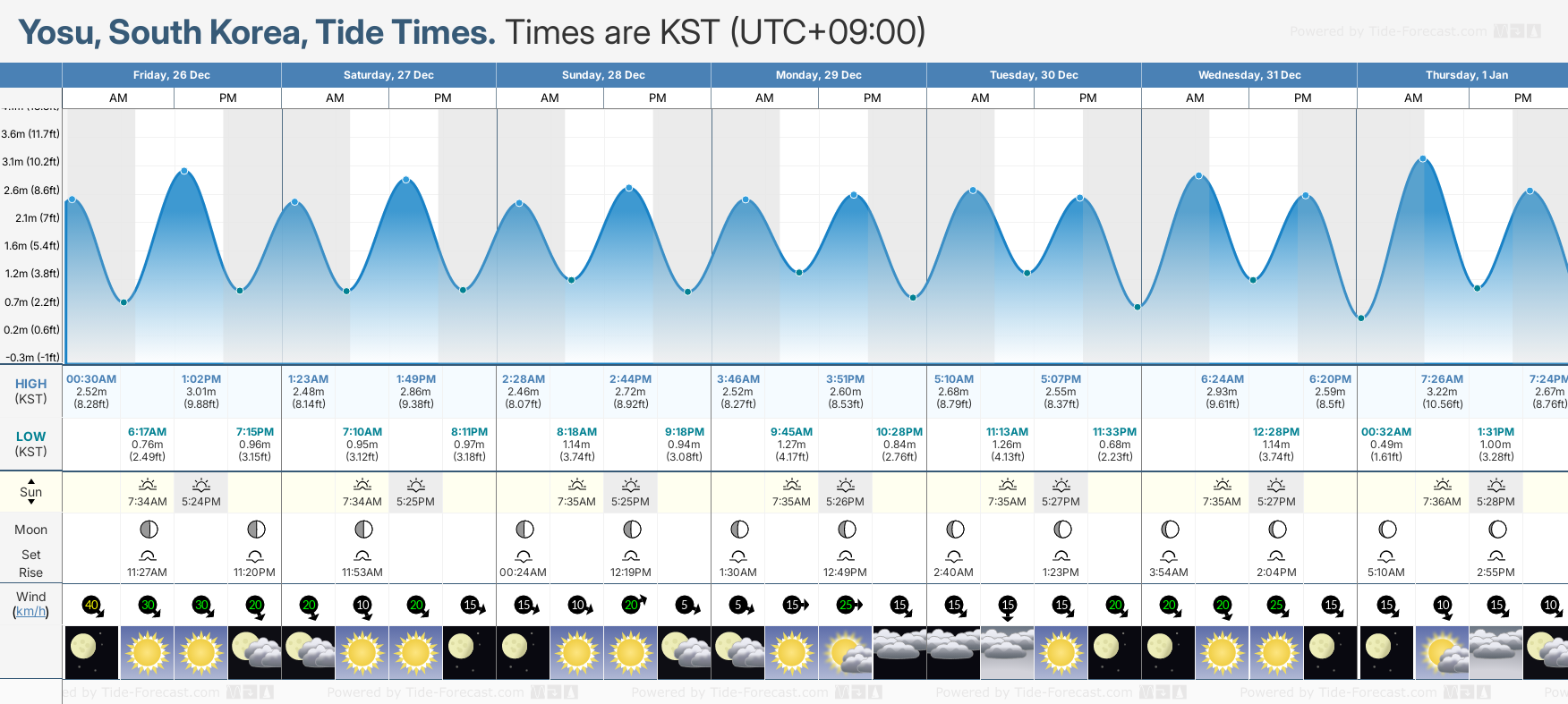 Tide Times for Yosu (tomorrow): Saturday 27 December 2025