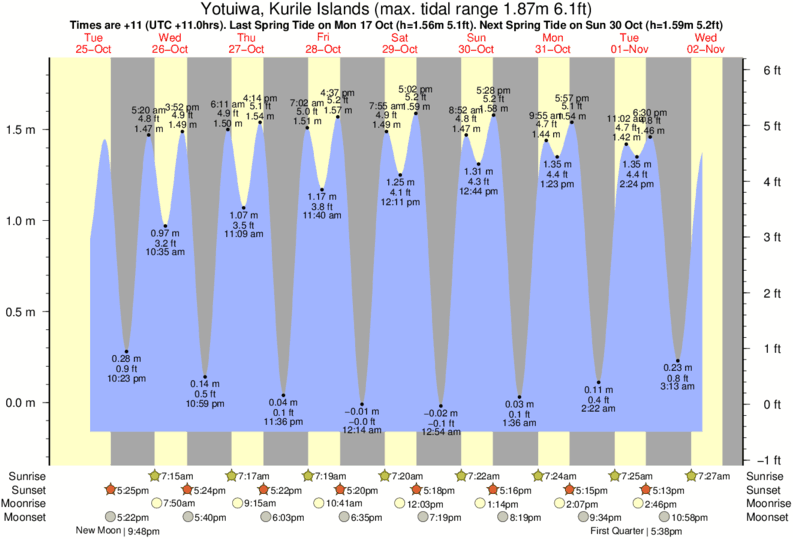 Yotuiwa tide chart key: The tide chart above shows the height and times of high tide and low tide for Yotuiwa, Kurile Islands. The grey shading corresponds to nighttime hours between sunset and sunrise at Yotuiwa.