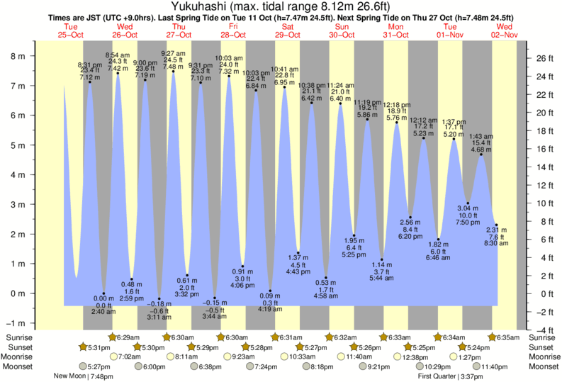 Tide chart for YukuhashiShowing low and high tide times for the next 30 days at Yukuhashi. Tide Times are JST (UTC +9.0hrs).