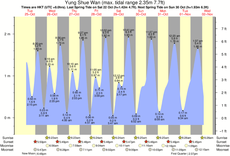 Tide Times are HKT (UTC +8.0hrs). Last Spring High Tide at Yung Shue Wan was on Sun 07 Dec (height: 2.13m 7.0ft). Next high Spring Tide at Yung Shue Wan will be on Tue 23 Dec (height: 1.91m 6.3ft).