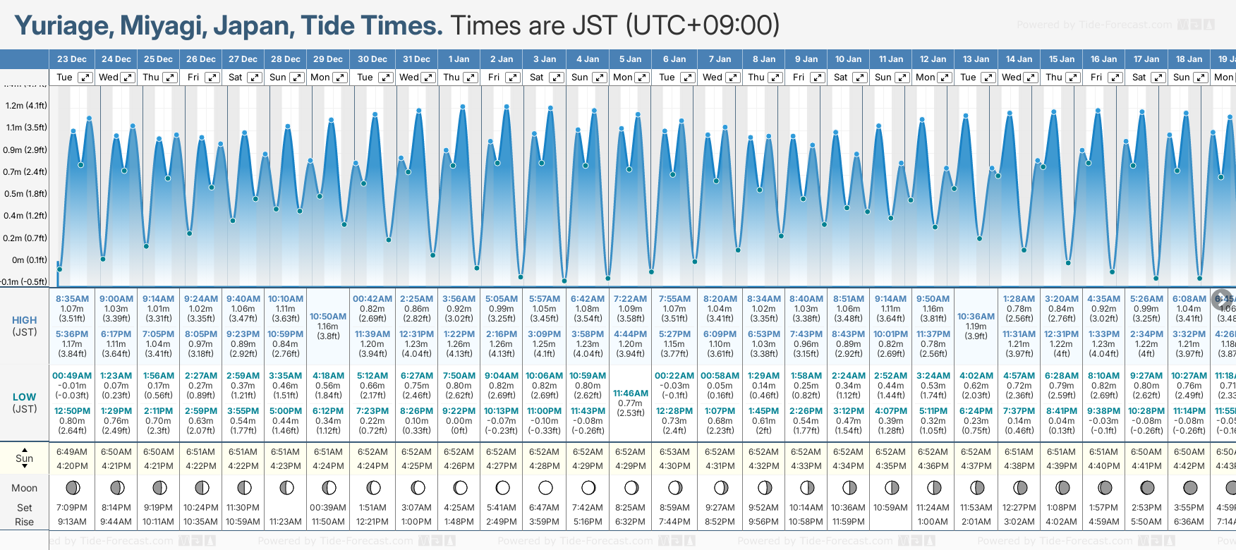 December and January Tide charts for Yuriage: The tide charts below show the height, time and date of high and low tides for the next 30 days.