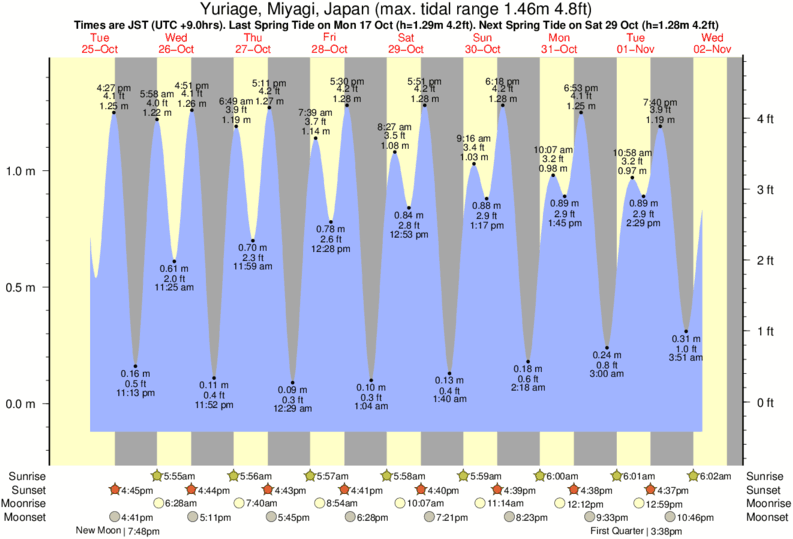Yuriage tide chart key: The tide chart above shows the height and times of high tide and low tide for Yuriage, Miyagi, Japan. The grey shading corresponds to nighttime hours between sunset and sunrise at Yuriage.