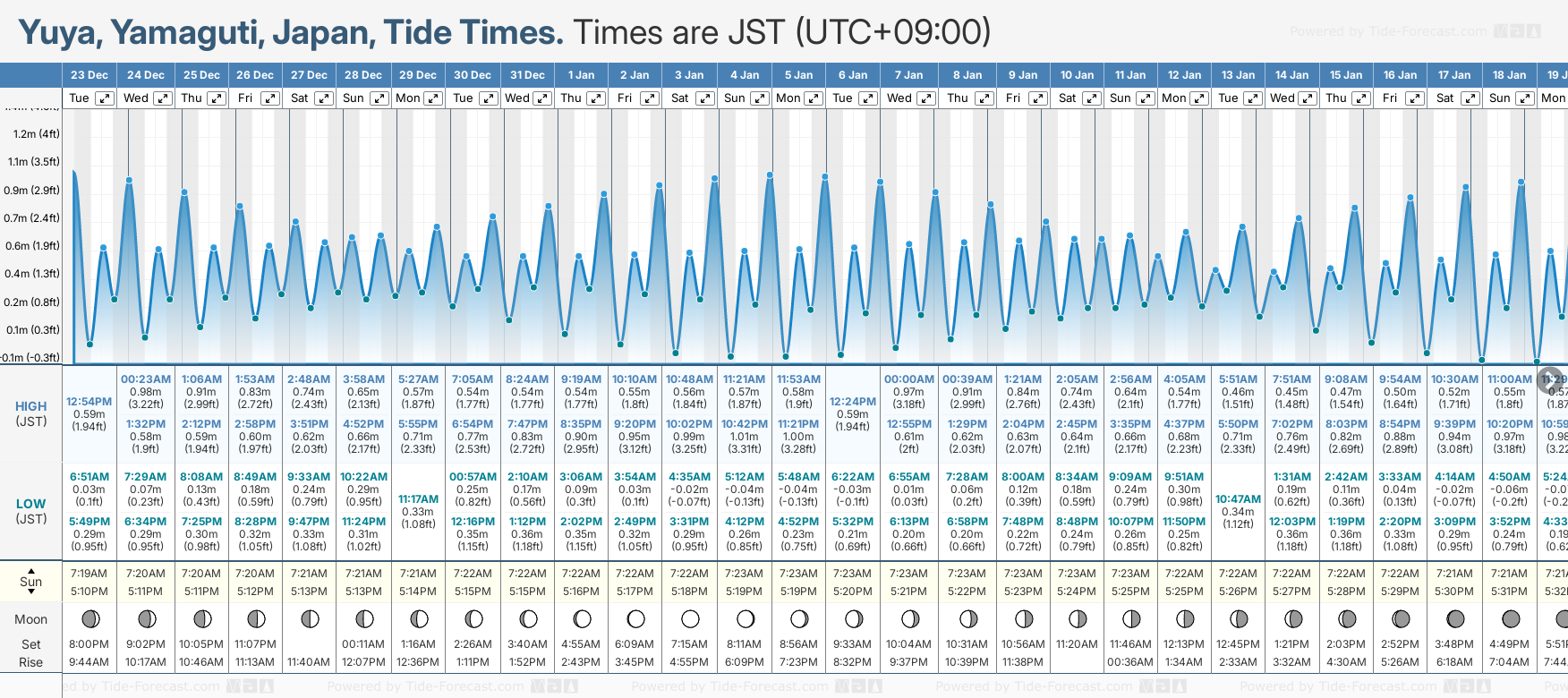 December and January Tide charts for Yuya: The tide charts below show the height, time and date of high and low tides for the next 30 days.