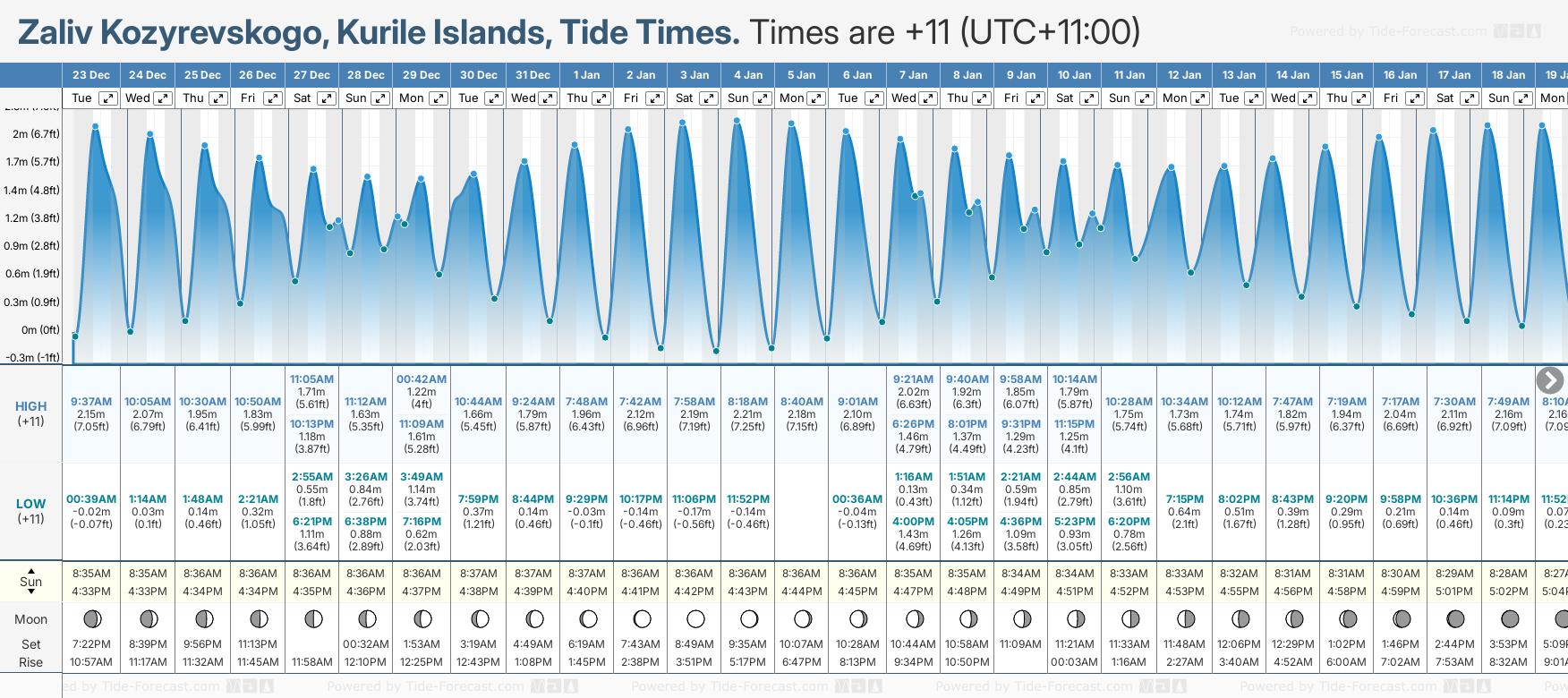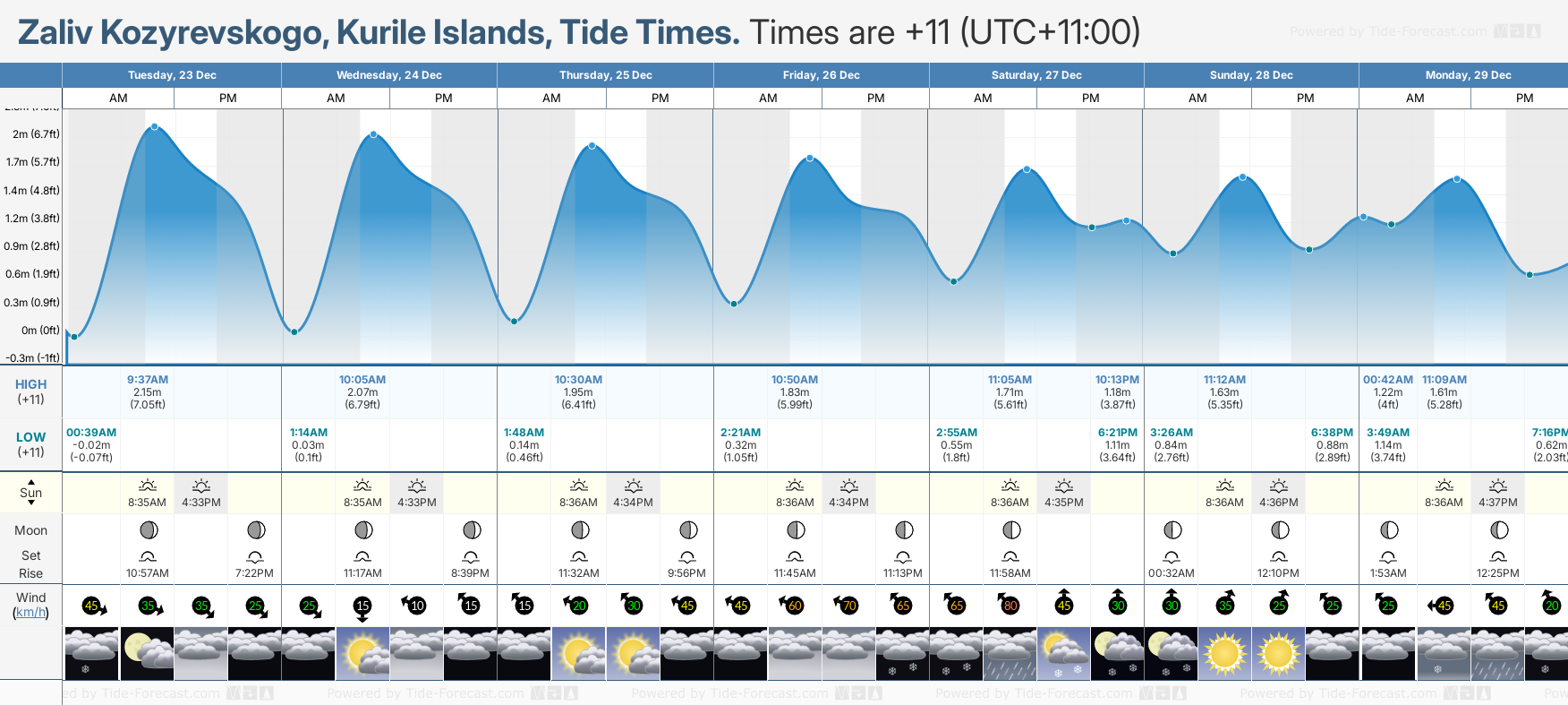 December and January Tide charts for Zaliv Kozyrevskogo: The tide charts below show the height, time and date of high and low tides for the next 30 days.