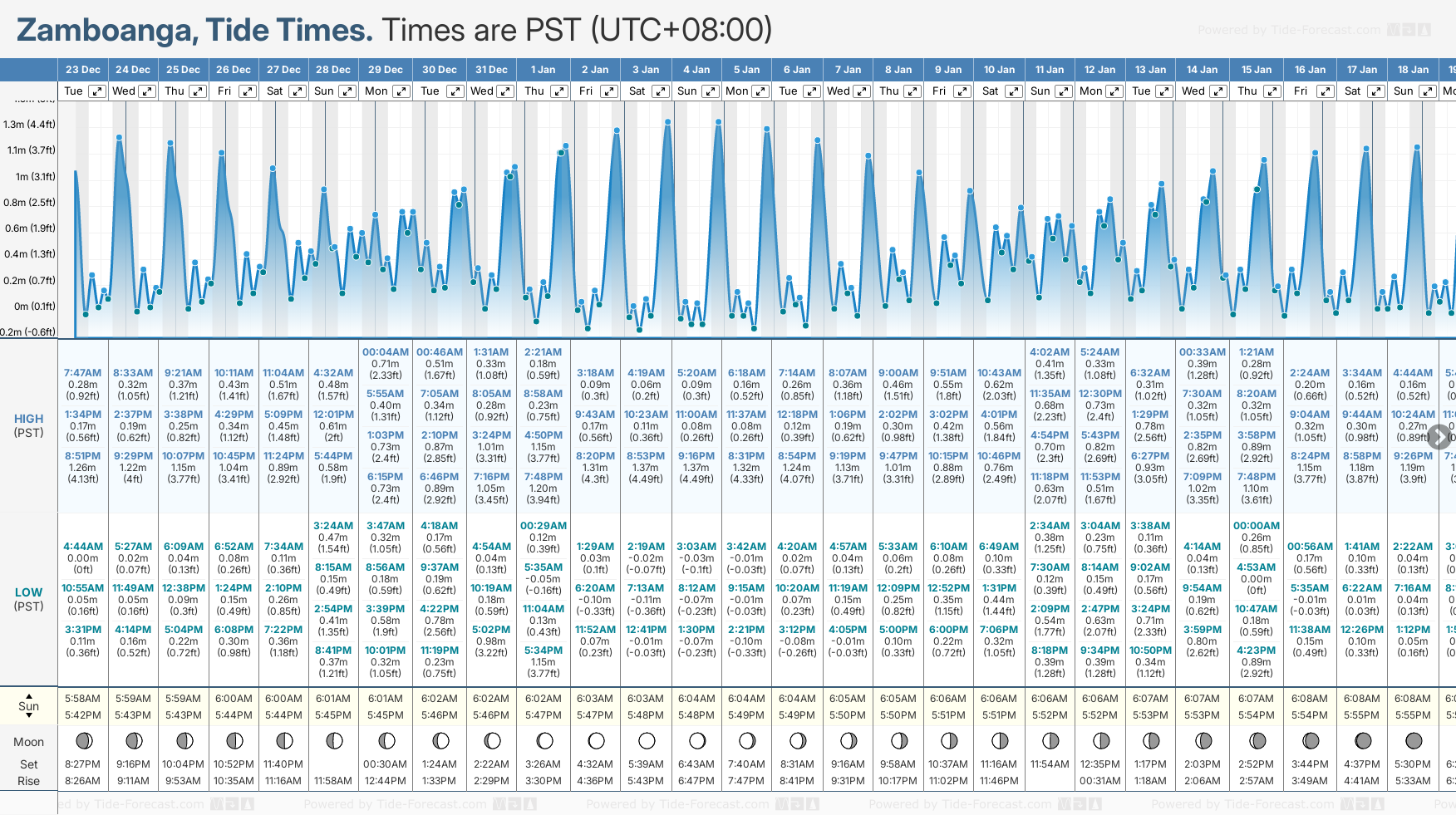 December and January Tide charts for Zamboanga: The tide charts below show the height, time and date of high and low tides for the next 30 days.