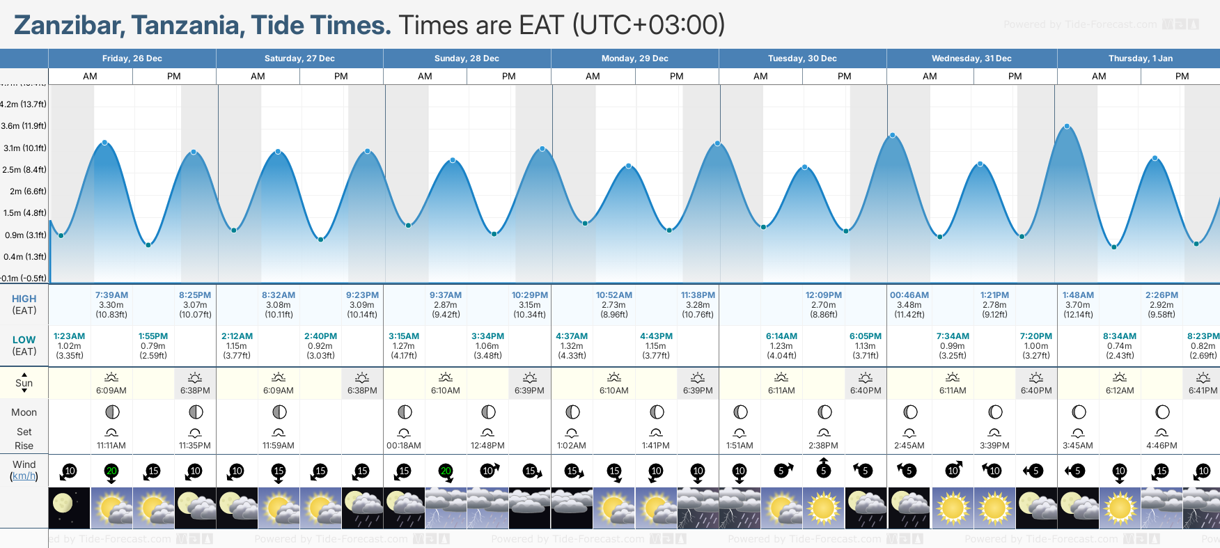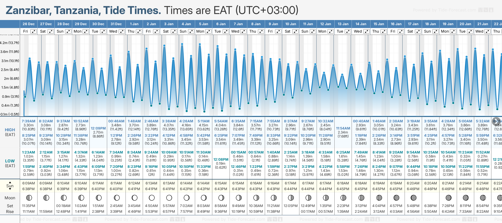 December and January Tide charts for Zanzibar: The tide charts below show the height, time and date of high and low tides for the next 30 days.