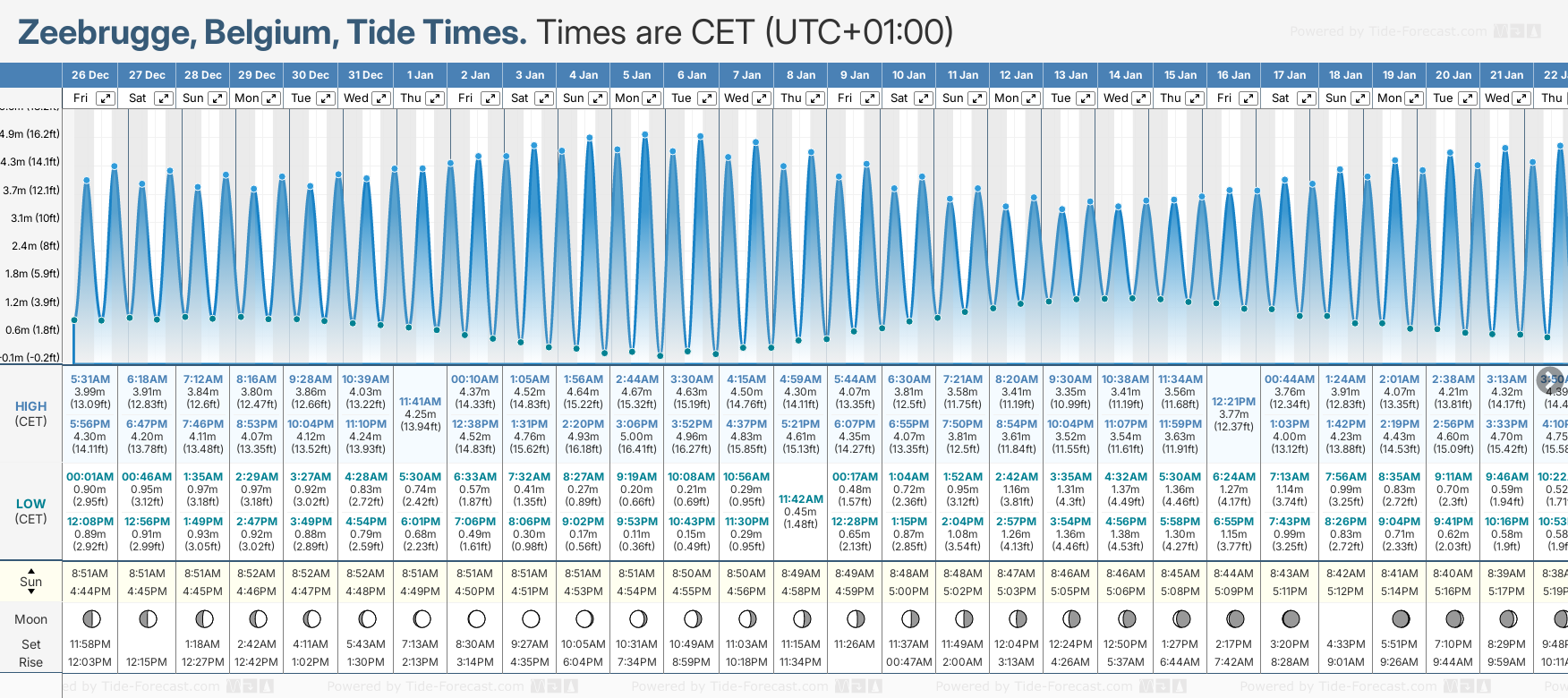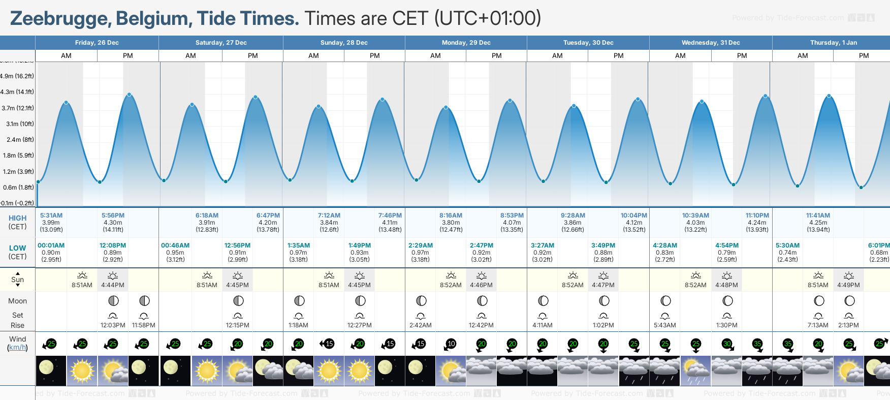 December and January Tide charts for Zeebrugge: The tide charts below show the height, time and date of high and low tides for the next 30 days.