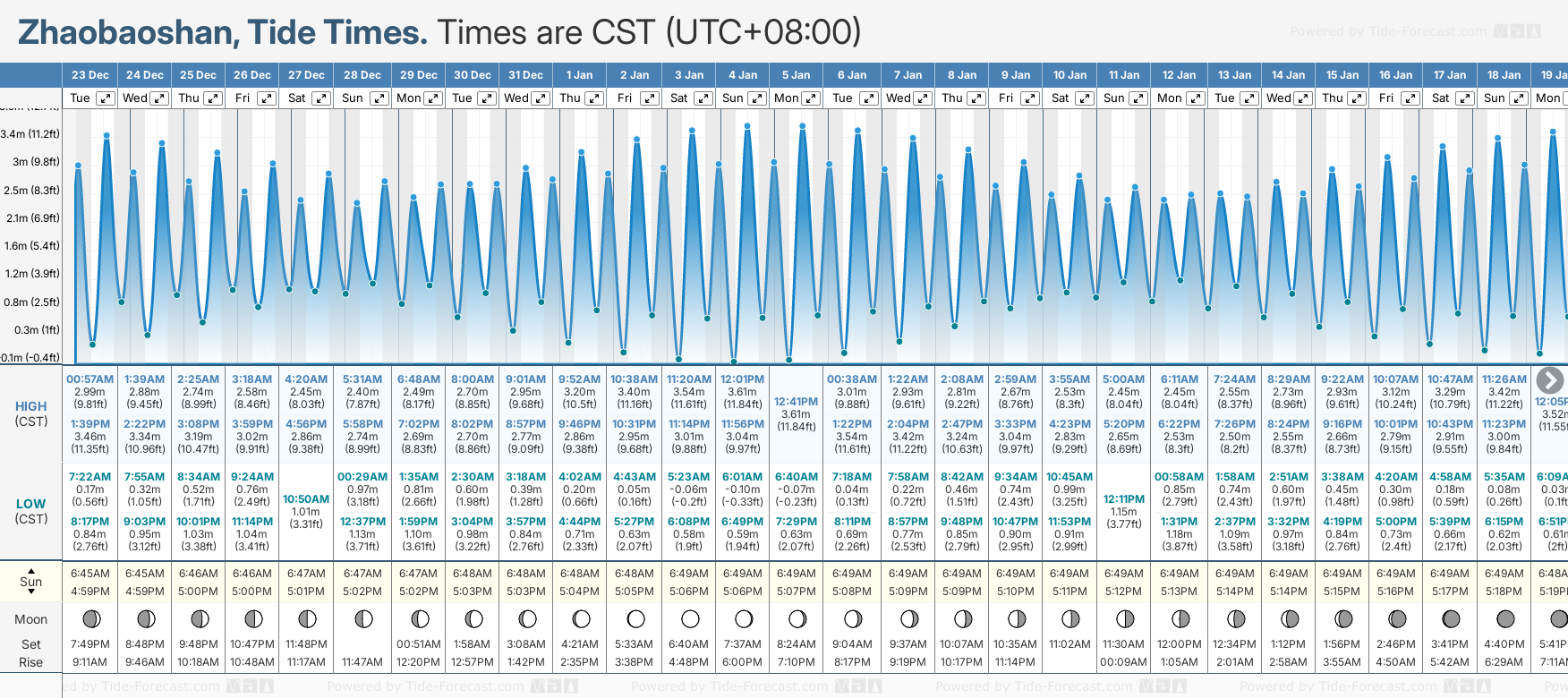 December and January Tide charts for Zhaobaoshan: The tide charts below show the height, time and date of high and low tides for the next 30 days.