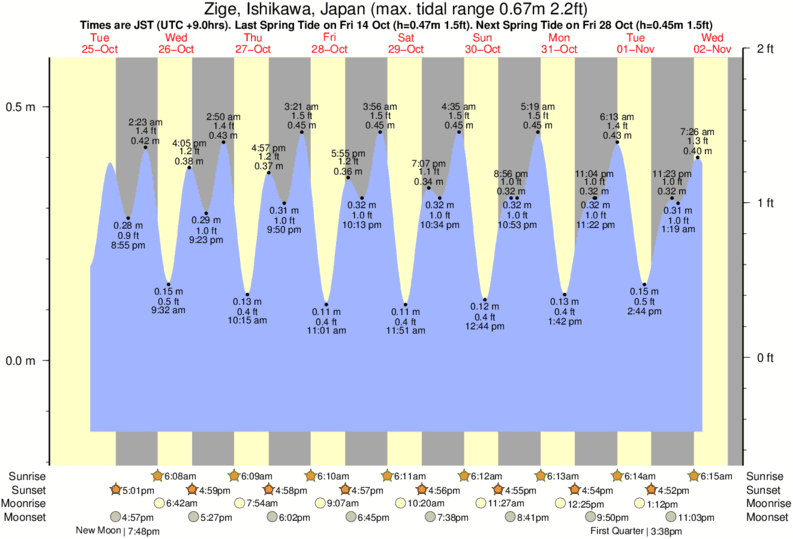 Tide Times are JST (UTC +9.0hrs). Last Spring High Tide at Zige was on Sun 07 Dec (height: 0.38m 1.2ft). Next high Spring Tide at Zige will be on Sun 21 Dec (height: 0.29m 1.0ft).