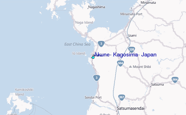 Use this relief map to navigate to tide stations, surf breaks and cities that are in the area of Akune, Kagosima, Japan.