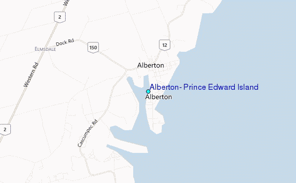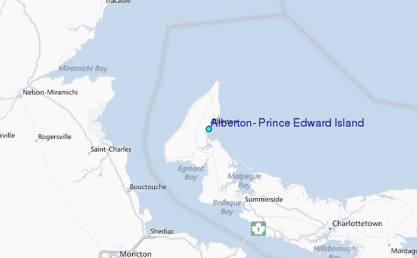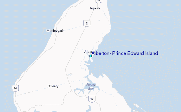 Use this relief map to navigate to tide stations, surf breaks and cities that are in the area of Alberton, Prince Edward Island.