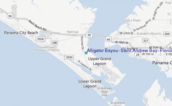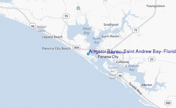 Use this relief map to navigate to tide stations, surf breaks and cities that are in the area of Alligator Bayou, Saint Andrew Bay, Florida.