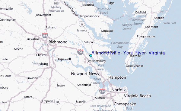 Use this relief map to navigate to tide stations, surf breaks and cities that are in the area of Allmondsville, York River, Virginia.
