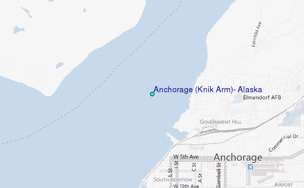 Use this relief map to navigate to tide stations, surf breaks and cities that are in the area of Anchorage (Knik Arm), Alaska.