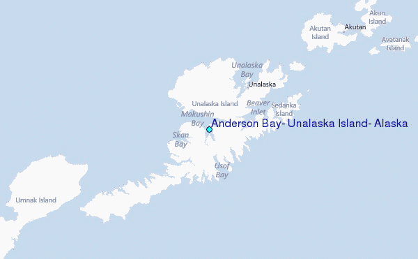 Use this relief map to navigate to tide stations, surf breaks and cities that are in the area of Anderson Bay, Unalaska Island, Alaska.