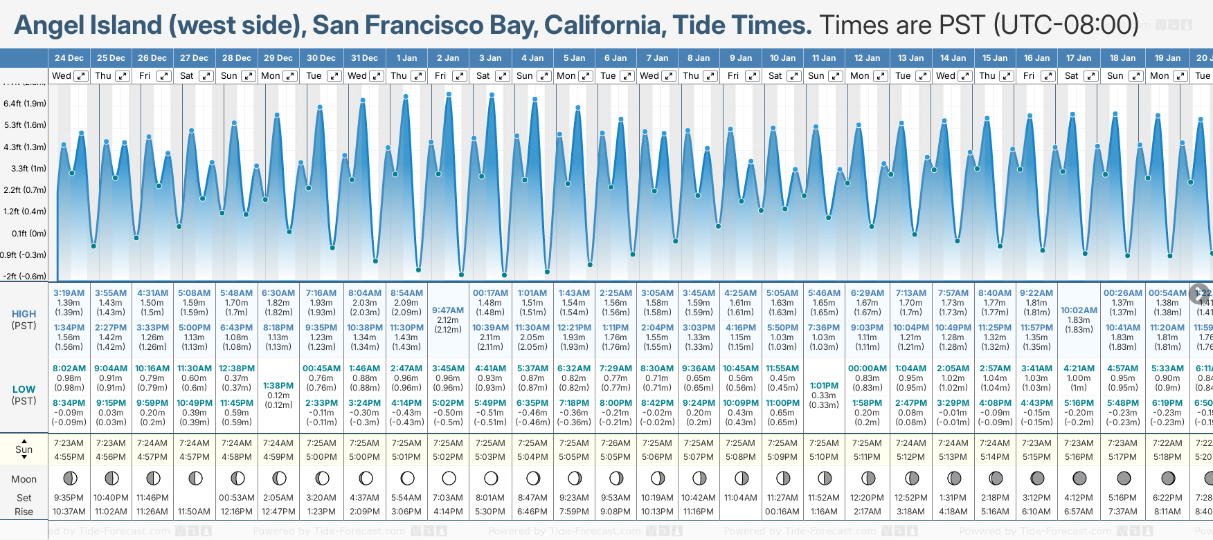 December and January Tide charts for Angel Island (west side), San Francisco Bay: The tide charts below show the height, time and date of high and low tides for the next 30 days.