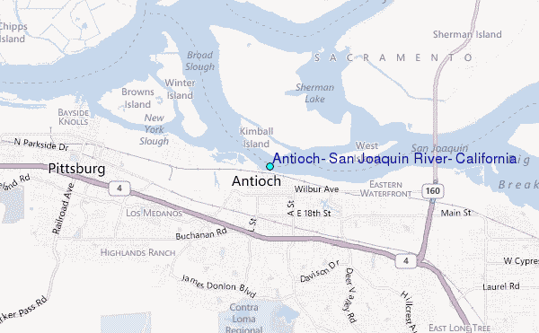 Use this relief map to navigate to tide stations, surf breaks and cities that are in the area of Antioch, San Joaquin River, California.