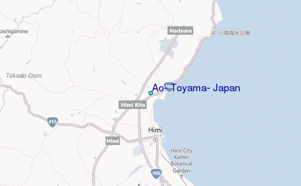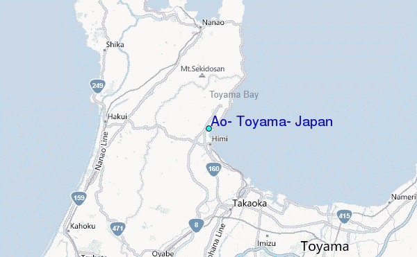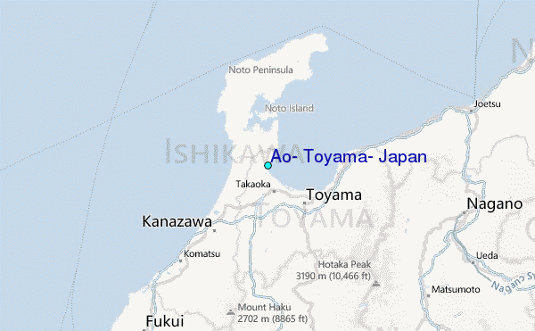 Use this relief map to navigate to tide stations, surf breaks and cities that are in the area of Ao, Toyama, Japan.