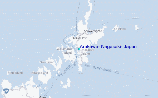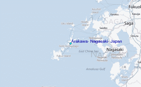 Use this relief map to navigate to tide stations, surf breaks and cities that are in the area of Arakawa, Nagasaki, Japan.