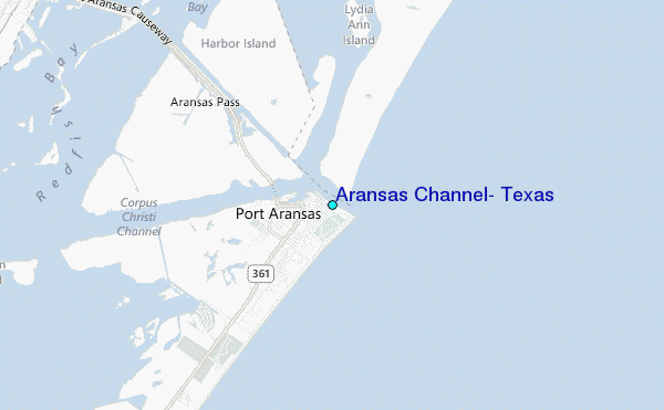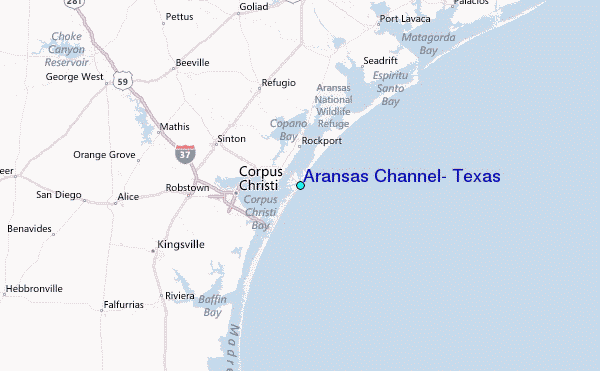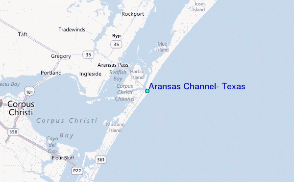 Use this relief map to navigate to tide stations, surf breaks and cities that are in the area of Aransas Channel, Texas.