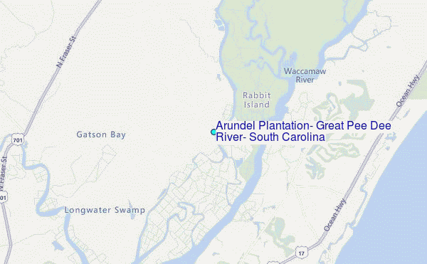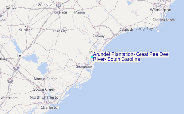 Use this relief map to navigate to tide stations, surf breaks and cities that are in the area of Arundel Plantation, Great Pee Dee River, South Carolina.