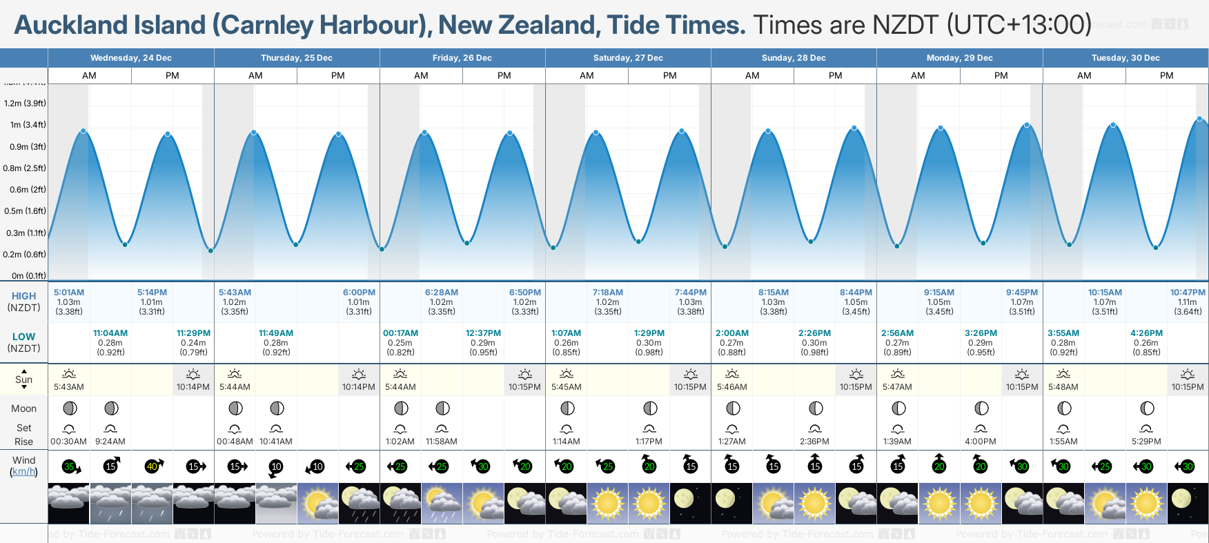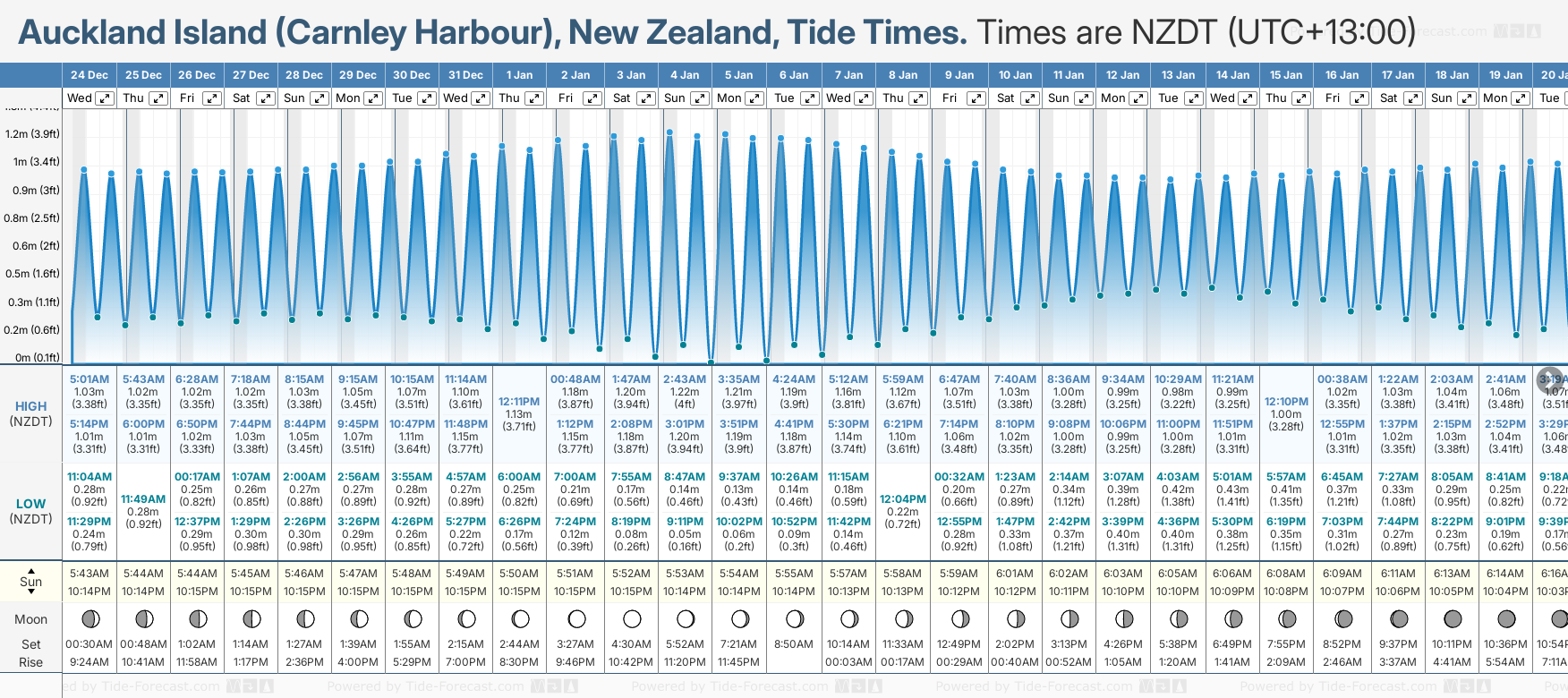 December and January Tide charts for Auckland Island (Carnley Harbour): The tide charts below show the height, time and date of high and low tides for the next 30 days.